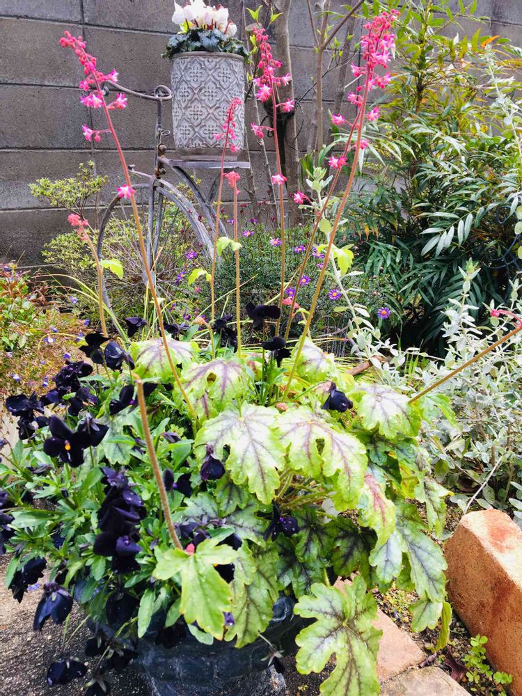 ヒューケラ とパンジー、、暴れております。可愛い鉢に植えたのですが、わかりましぇーん🤣