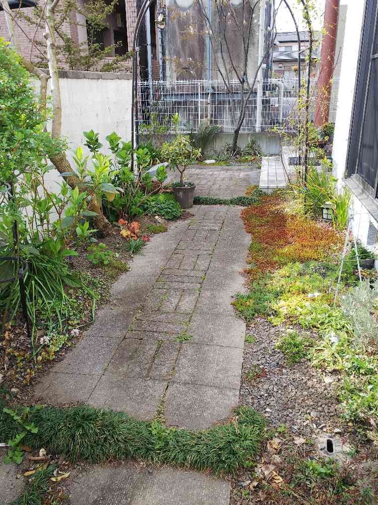宿根草やセダムがだいぶ色付いてきました。夏になると真っ暗になってしまう小道😅今年は頑張らねば。