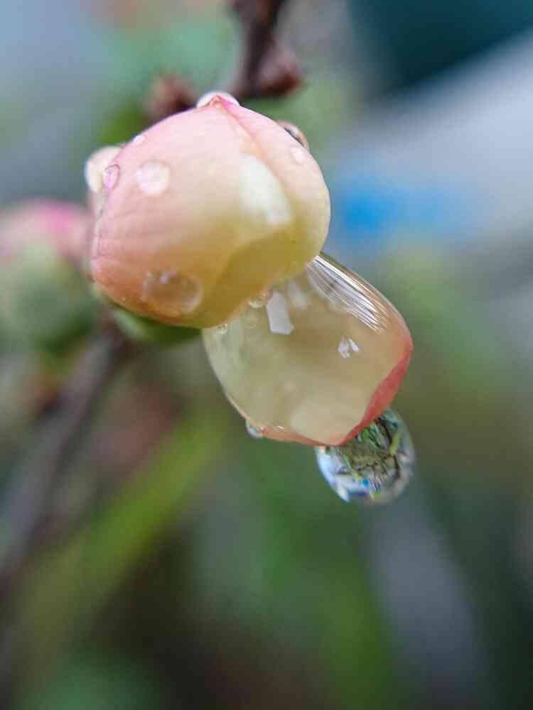 ボケの花びらに溜まった雨が…💧