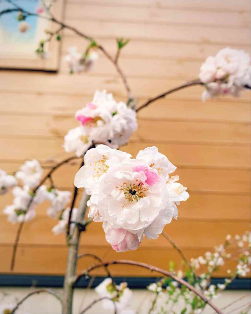 我が家の小さなハナモモの木。もこもこ花をつけ始めました。