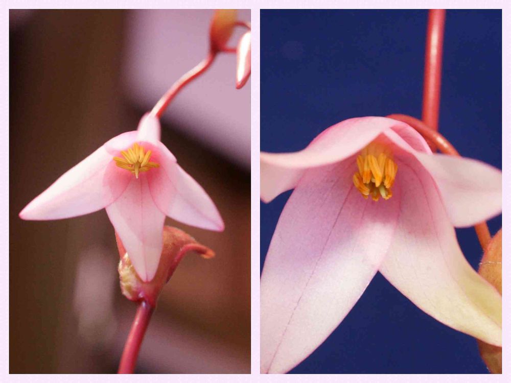 左の花は、雌しべが突き出ている状態で、雄しべは雌しべの根元に塊り、少し横に拡がった感じです。