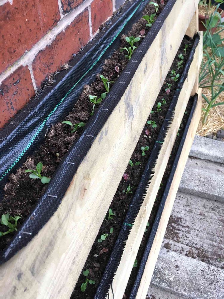 チンゲンサイとサラダ菜を植え替えました✨。チンゲンサイは去年とう立ち後に種を採ったものを植えました😄。奥のはニンニク🧄です