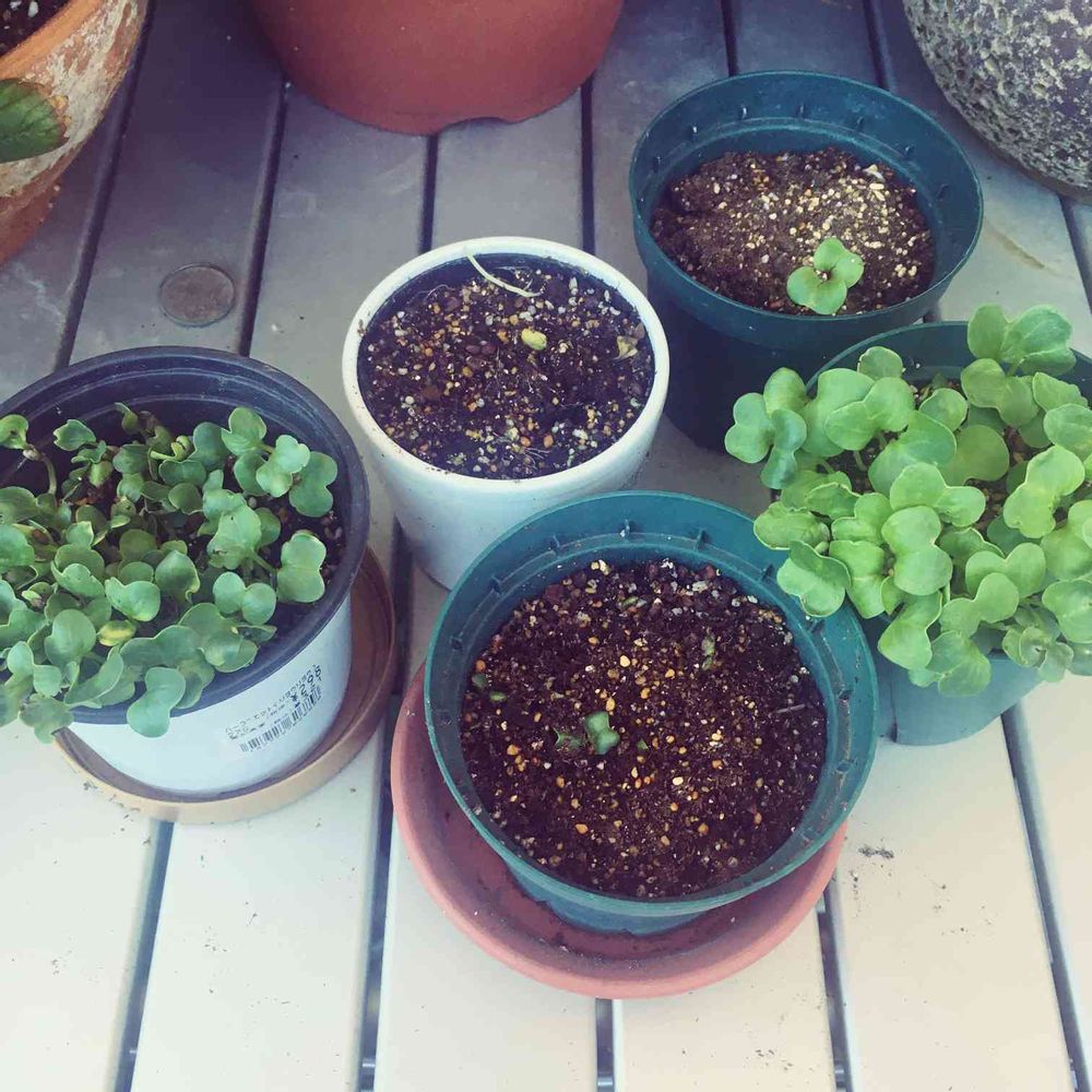 上中央は昨夜収穫しました。2つの小鉢にはまた種蒔きしました。