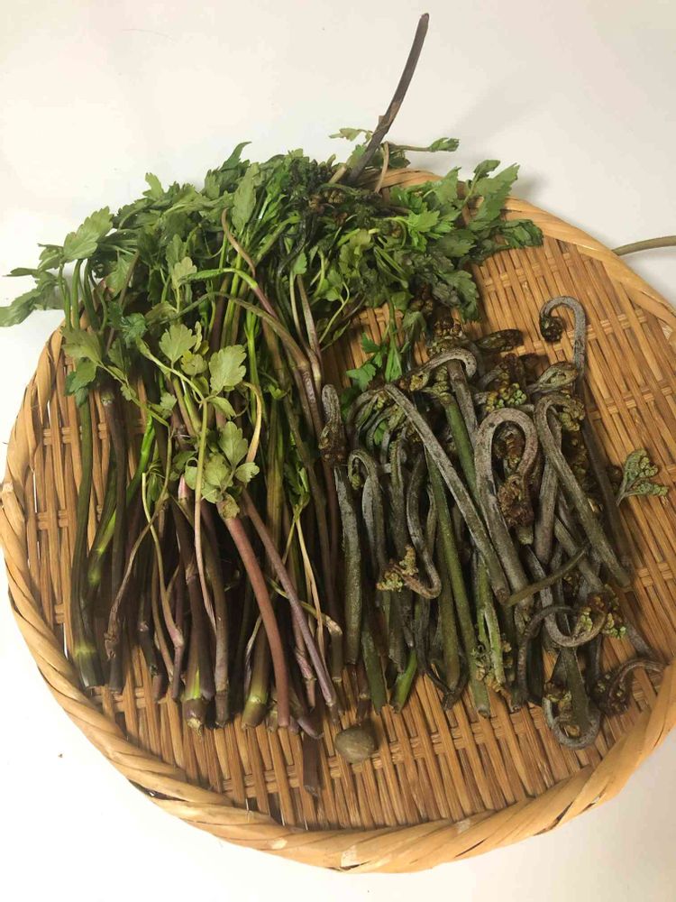 ワラビとむかごも一個、、この萎れたのはなんだろ?セリの匂いはしません。