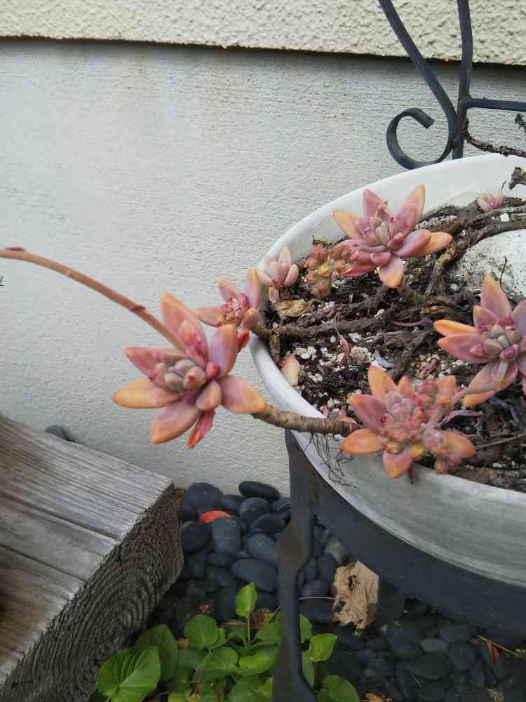 延びた先に黄色い花が咲いています。この多肉さんの名前を教えてください。