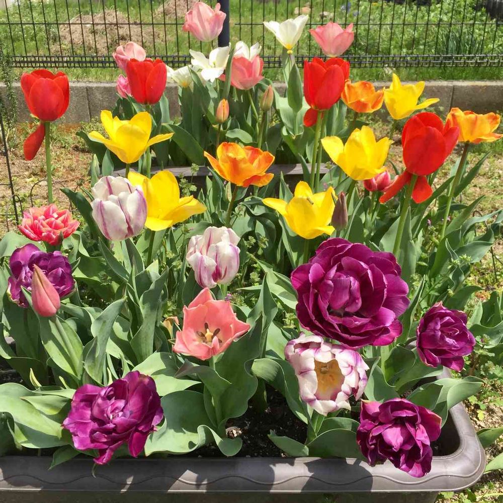 地植えとプランターのチューリップを寄せ集めて撮りました。まだ咲いてないのもあるけど、これが今春のハイライトかな?