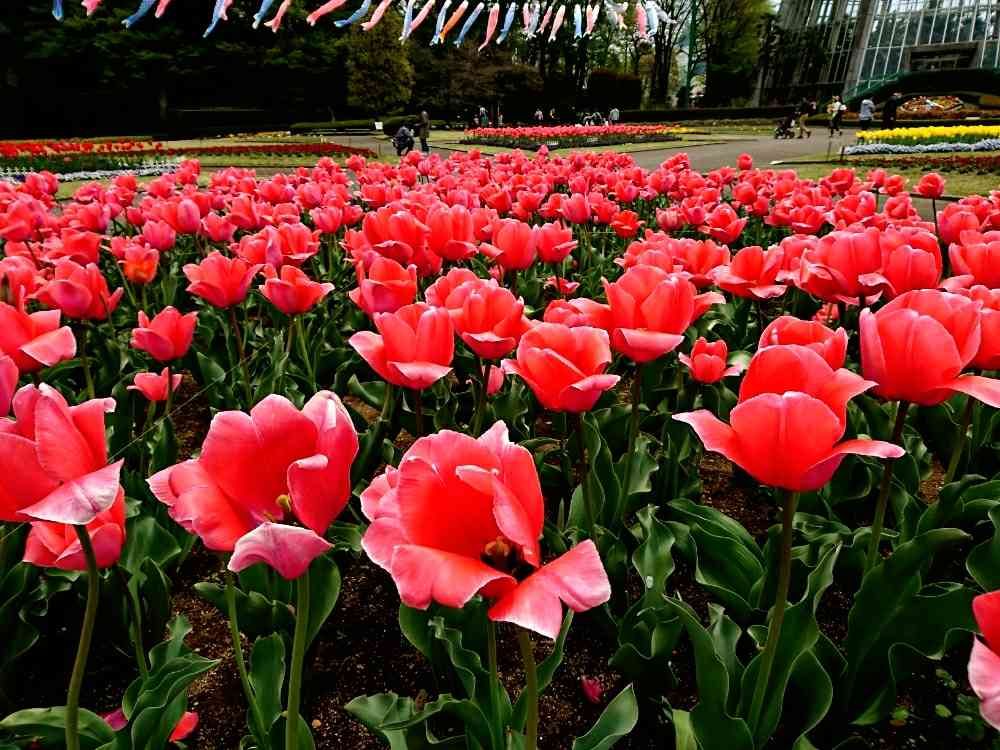 市内の植物園です、チューリップ畑です、遠くに鯉のぼりも見えます😃🌷🎏