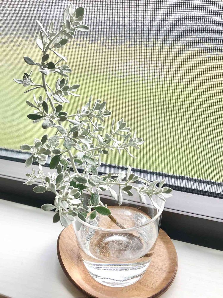 寄植えに使っていたオレアリア・リトルスモーキーさんの枝がポキりといっていたので、とりあえず水に差してみました。