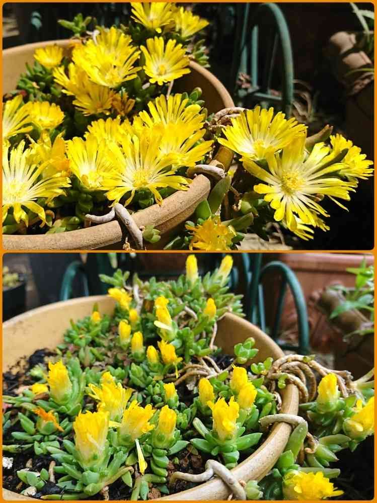 今日は朝から天気が良くて、マツバギクも全開になりました😄💠 光と湿度に反応して開いたり、閉じたりするのだそうです😊鮮やかな黄色の花を見ると気分も上がります❕(花の名前はマツバギク、で良かったかな('_'?)