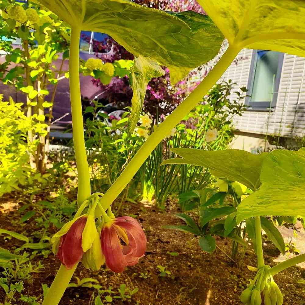 さん、こんにちは。山野草なんですよ。葉っぱがものすごく大きくて、カエルさん🐸傘みたいです。あ、次に葉っぱ投稿しますね。