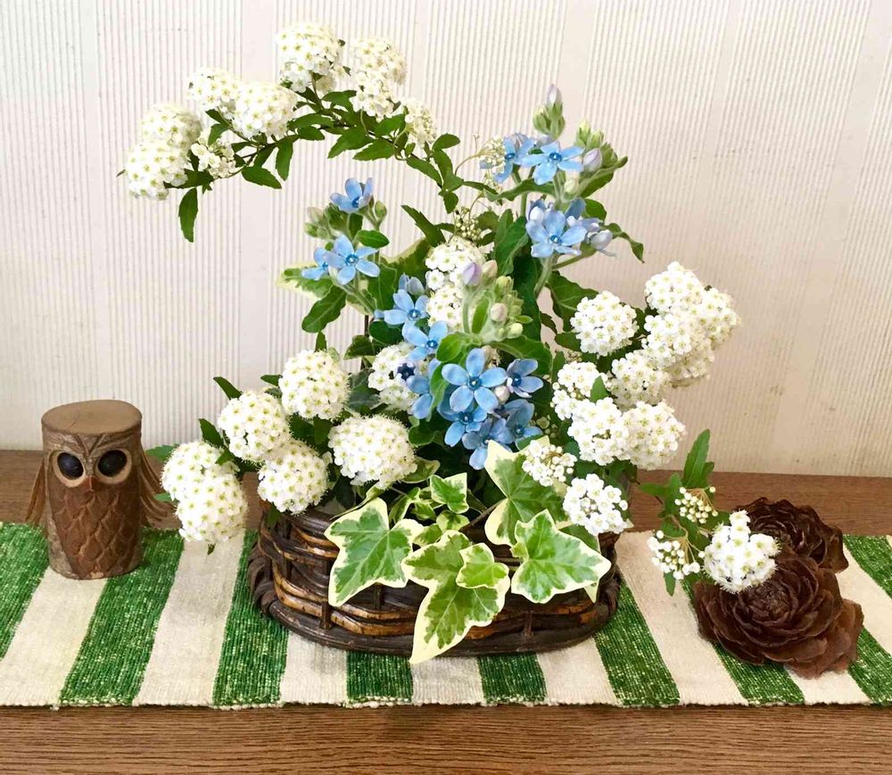 例年はシンプルな和風テイスト(去年の4月にアップした感じ)にしていたのですが、今年はいただきもののブルースター💠と玄関脇のグランドカバーにしているアイビー🌿を合わせて、野の花イメージ のつもり🙃