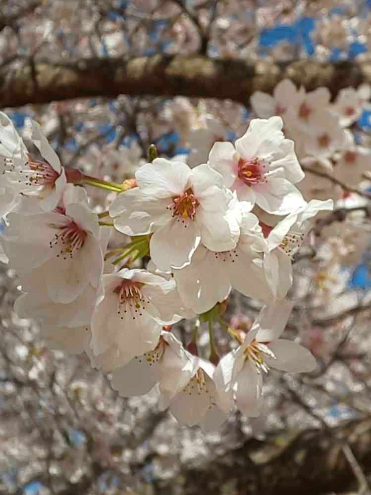 昨日ローカルニュースで教わったんだけど、桜の花の中心が赤いのはそろそろ散る準備に入っている証しだって。