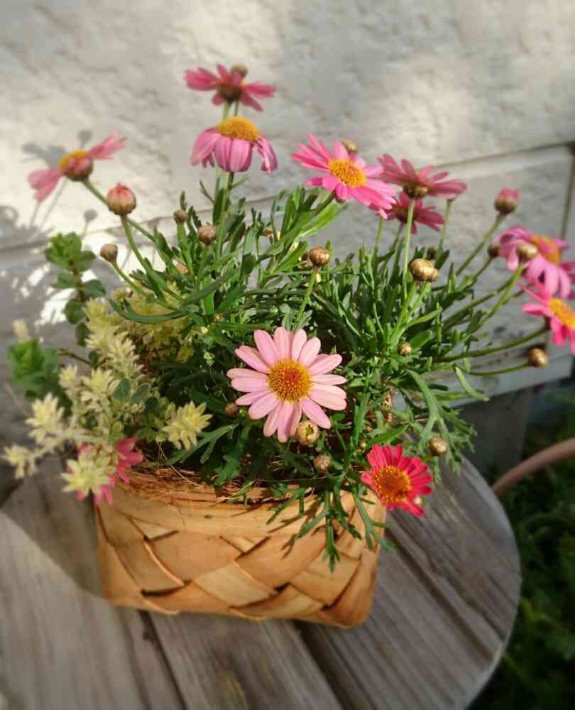 いいですね〜♪私もかごが大好きなので、よく植えます。目立たない場所に置くときは、白くスプレーしたりしています😊