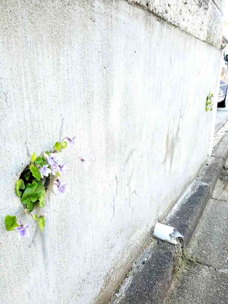 被害を確認中、塀の穴に咲くスミレ発見👀