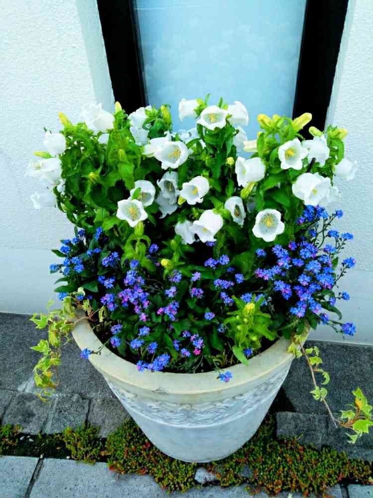 買い物の帰り道の、美容院の横の、カンパニュラの寄せ植えです。