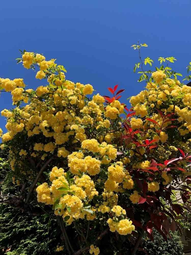 綺麗な青空をバックに、黄色のモッコウバラが、映えますねー🌼💙💓