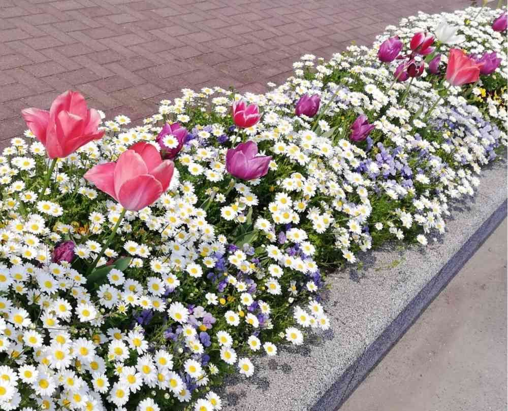 私の好きな花壇のお花です。ノースポール、チュウリップ。何処までも続いてきれいです。