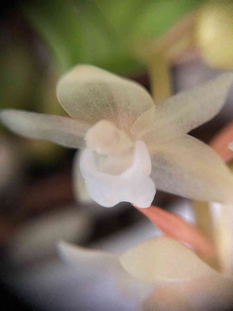 ドアップにしてみました。花弁の透け感がわかると思います。白いリップの中に蜜がたくさん入っています。溢れたりしないのかな?1輪の花の大きさは1円玉の中にすっぽり入るぐらい。