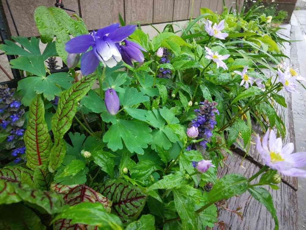 春の半日陰ゾーンの三大トリオ💜オダマキ、アジュガ、ミヤコワスレ😆