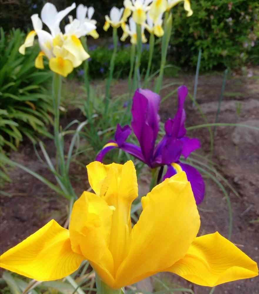 花壇に、1列色々なアイリスを