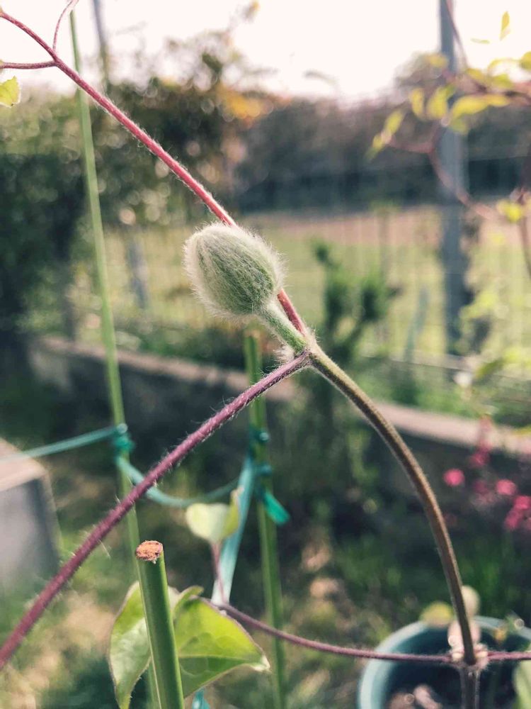 2年前に挿し穂をしたパテンス系のクレマチスです。2年目にしてやっと1つだけツボミをつけるまでになりました。