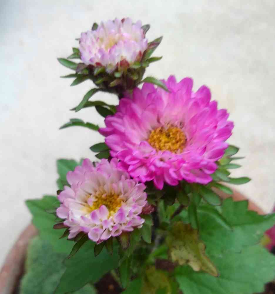 アスター 松本ピンク 花が3つ咲き始めました😃ピンクの濃さがこれから揃うのかな…❓