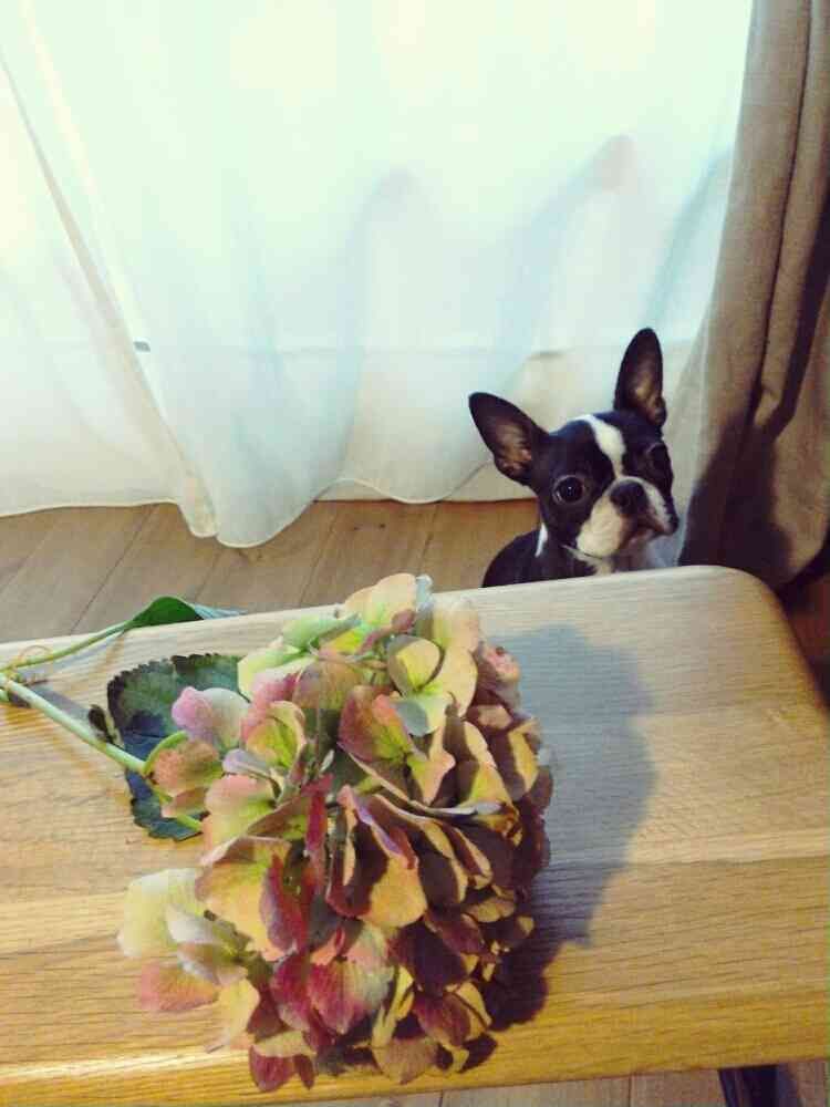 Ortensiaさん、有難うございます!! 娘の小梅ちゃん1歳です。あじさいをドライフラワーにしたくてストーブの前に置いたら、興味深々🍀😆