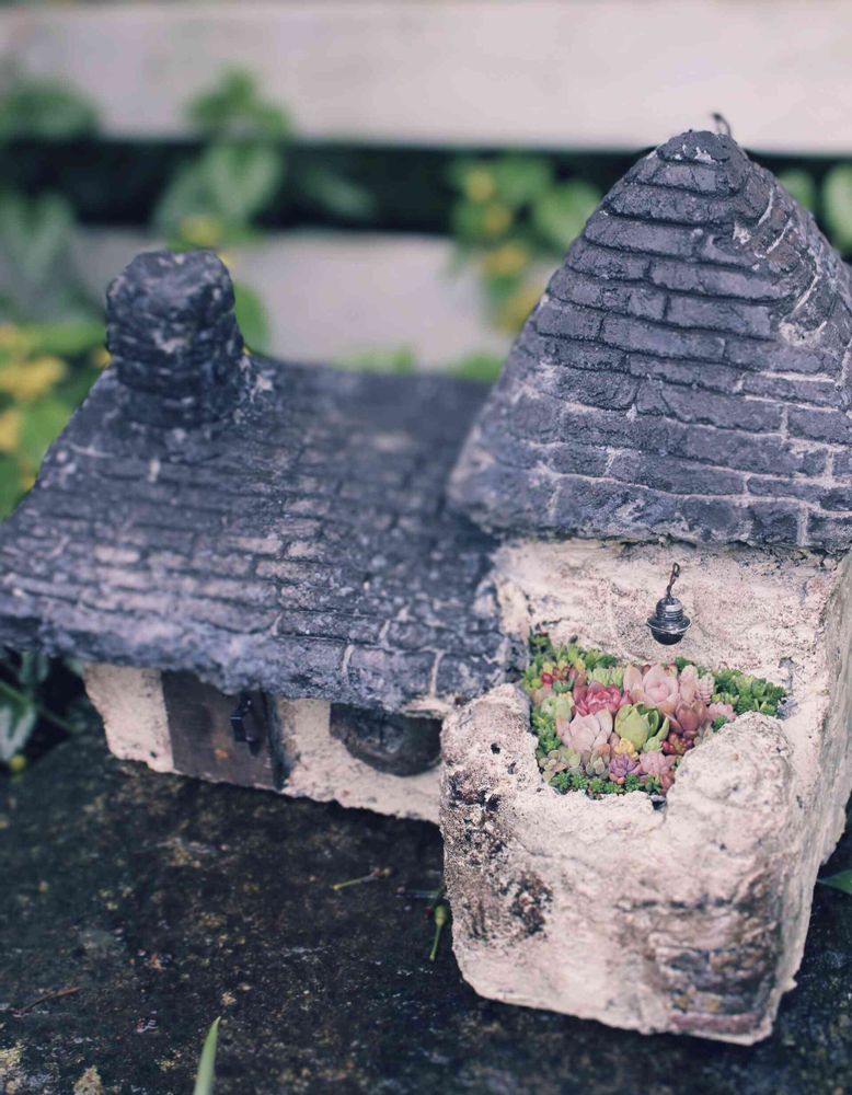 ユカイな庭友が作ってくれたモルタルハウス、通称トモピエ。ずっとそのまま飾ってたけど、やっと寄せ植えできました😊