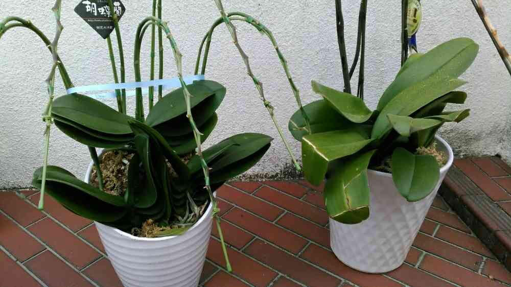 右は宮崎の舞華園で生産された白大輪V3。全国洋らん品評会金賞の札がかかってる。葉焼けが酷すぎるー😱