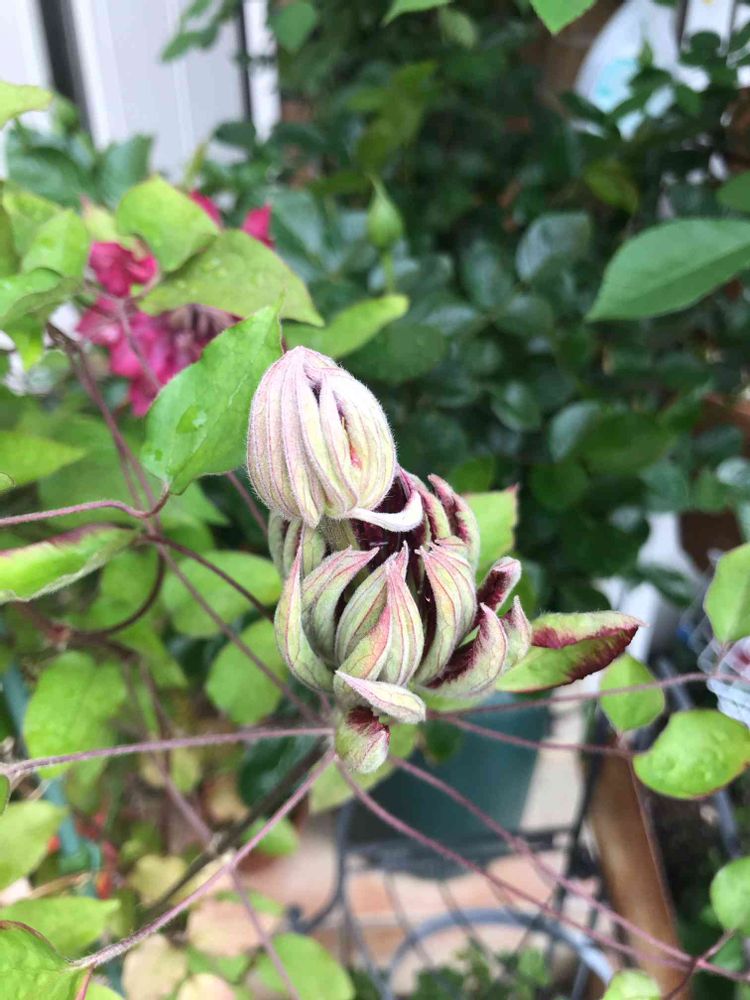 クレマチス 花炎。今朝見たら花の中から蕾がニョキっと、かんせいかって言うもの?不思議ですネ、自然は面白いナ(*゚Q゚*)ドキィー