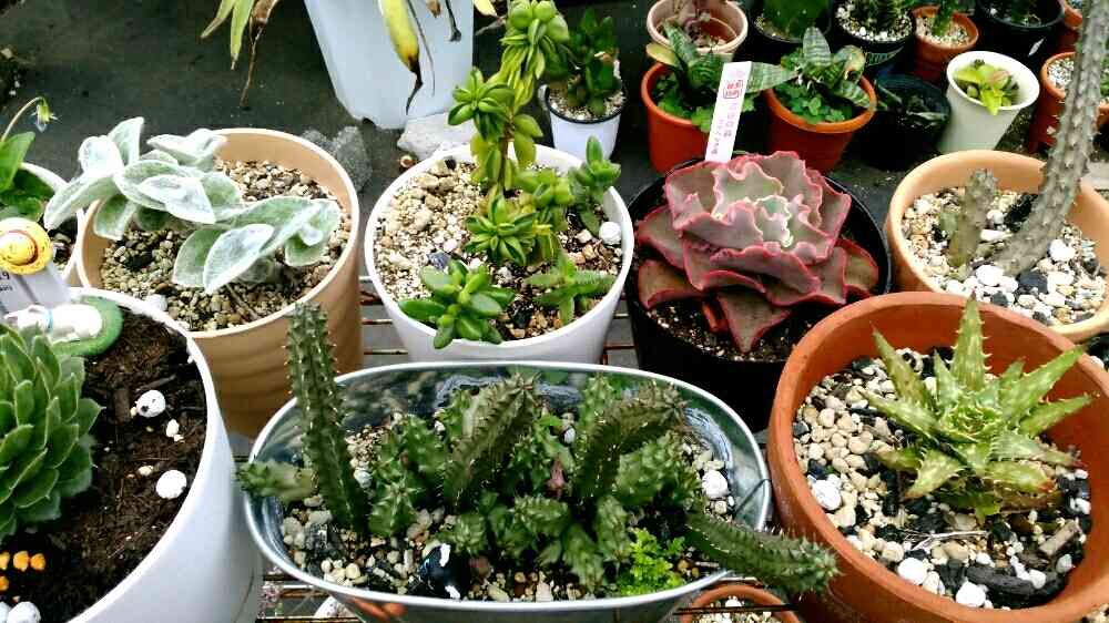 左上はトラデスカンチア属の白絹姫。その隣はペペロミアのカクタスビレ。その下はフエルニア属の何か?。で右側のはアロエの翡翠殿に似てます。
