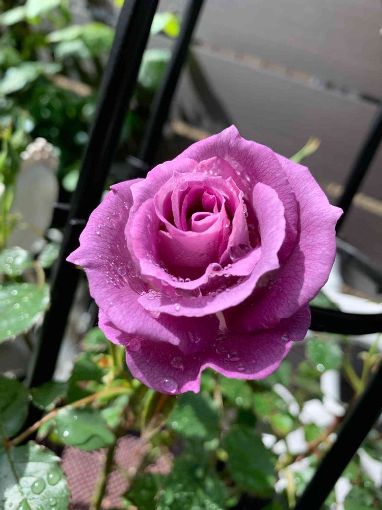雨が上がったのでお庭のチェックに出たところ、バラのブルーフォーユーが開花1番乗りでした🌹