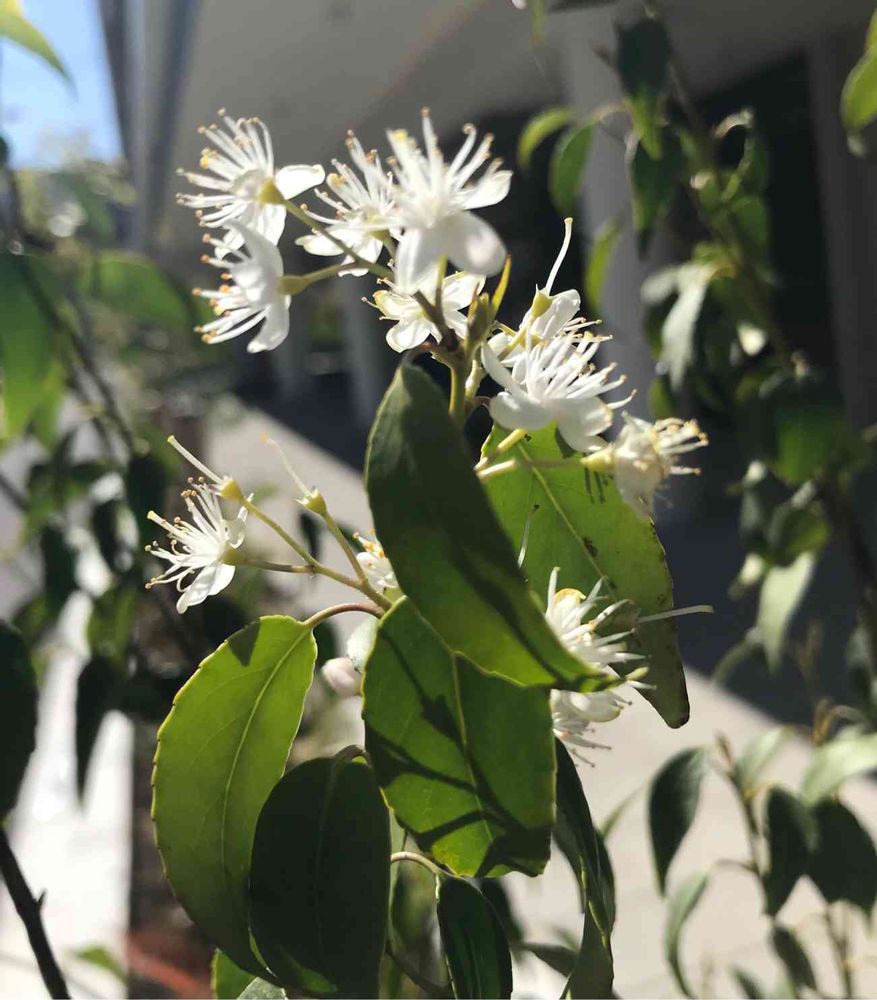 最近出来た施設の歩道に植えられた木に、花が咲いていました。