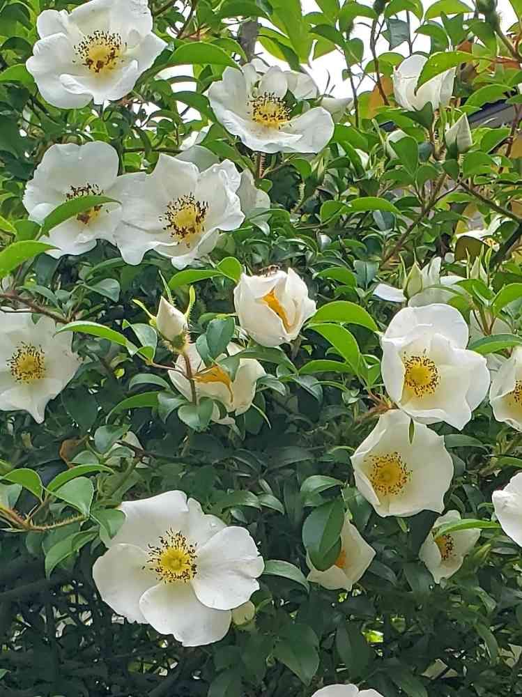 散歩道のナニワイバラが満開でした。たおやかなのに逞しい、そんなバラですね。