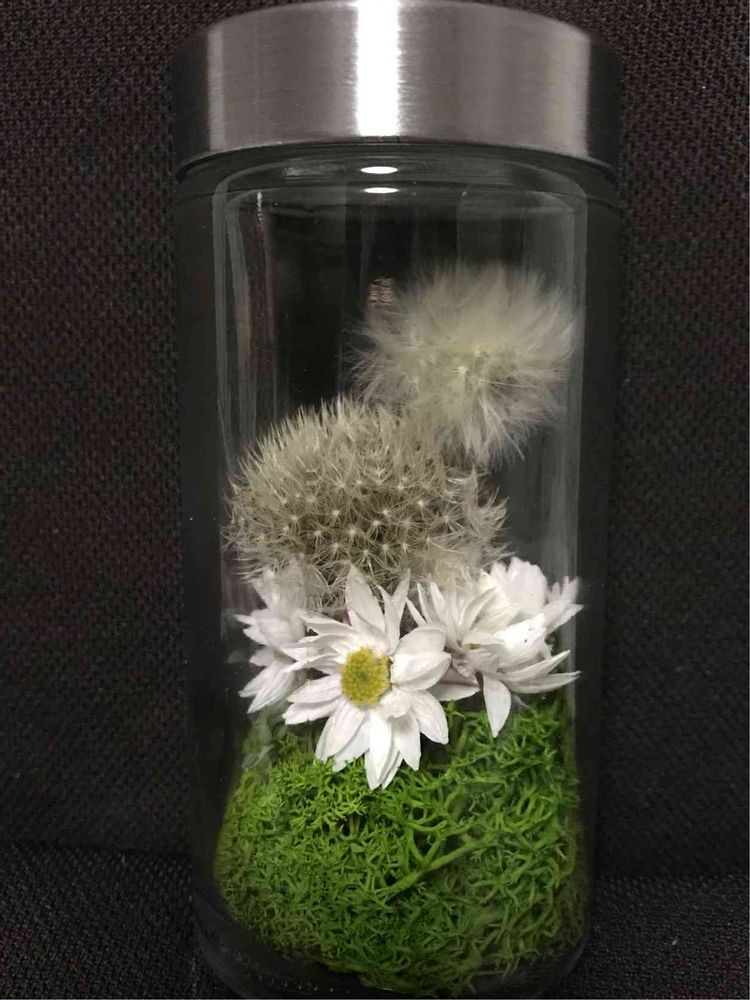 グリーンモスの上に庭で咲いていたペーパーカスケードさんと一緒にタンポポの綿毛を入れました🎶