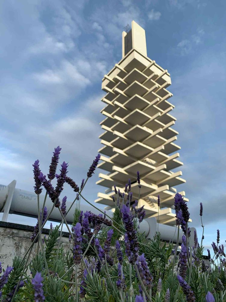 今晩は。面白い形のタワーですね。空を見上げると大きく深呼吸したくなりますよね。胸を張って背筋を伸ばすだけで免疫力が上がるそうです。一日に一回好きなお花と一緒に深呼吸したくなりました。❤️☺️
