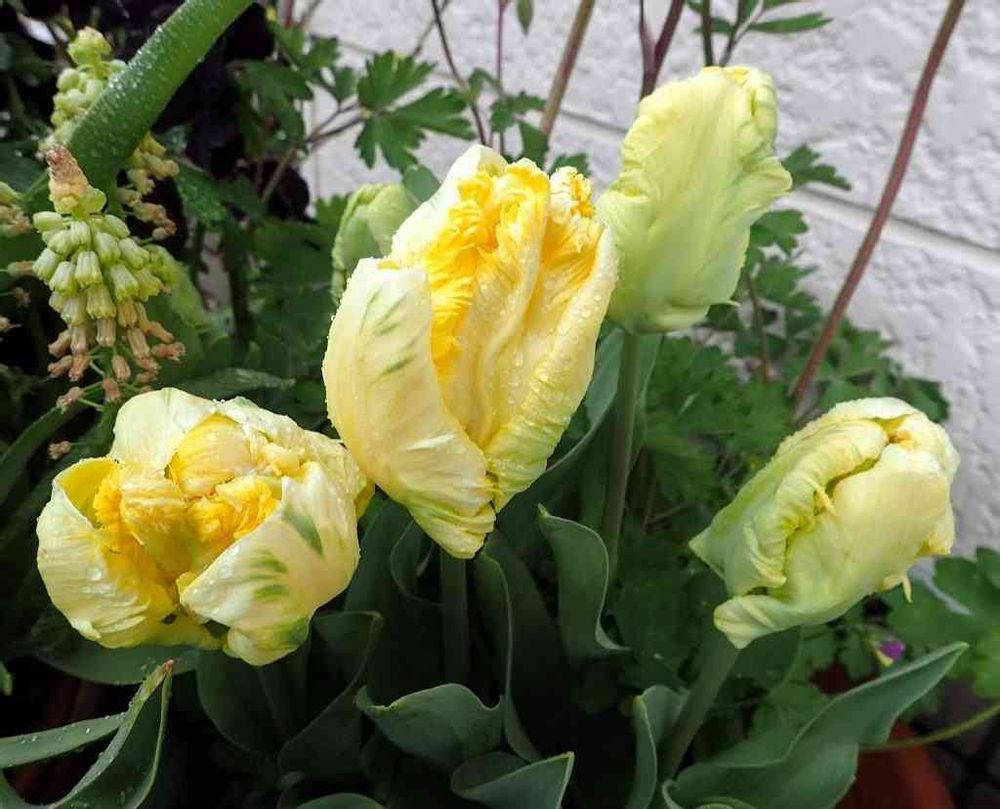 チューリップ・パロットゴールドです。花弁がオウムの羽のように変形してもふもふとなっているのをパロット咲といいます。これは黄色の、パロットゴールドという品種ですが、咲き始めはグリーンを帯びていてきれいですね😍💛😍