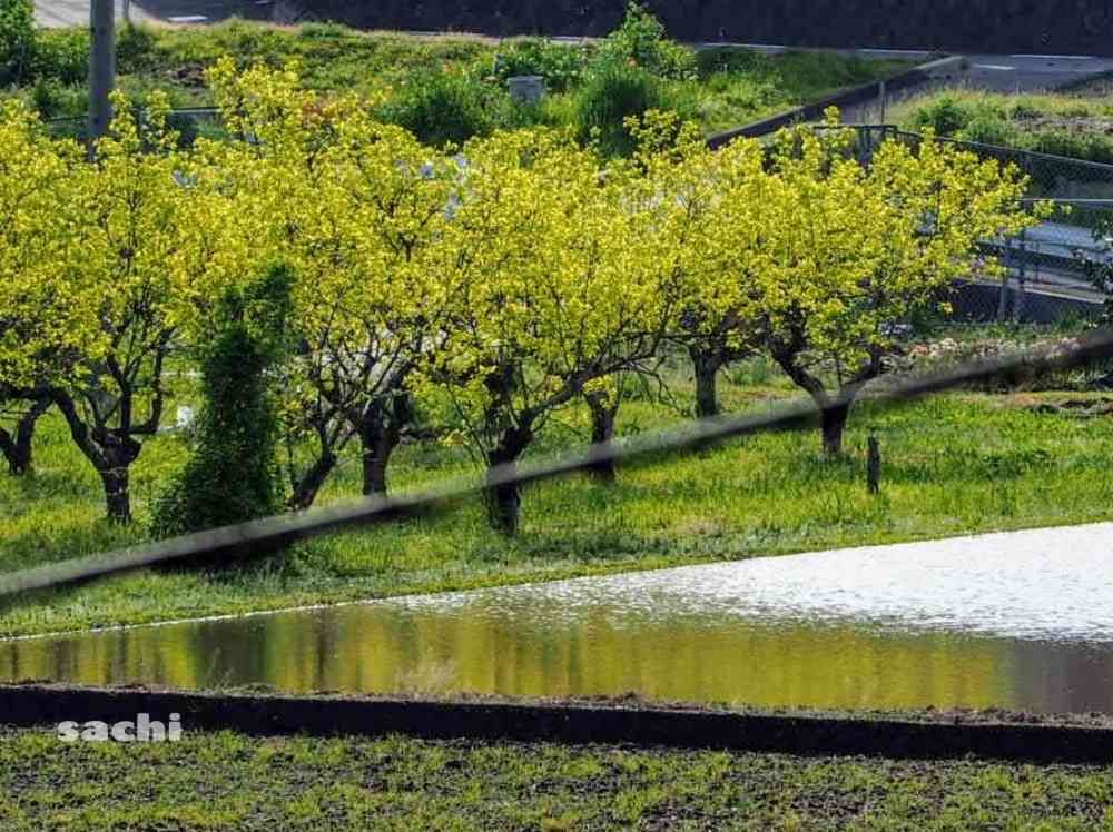 水が入った田んぼに新芽が出た柿の木が並んでいるって素敵な風景見れるんですね🍀