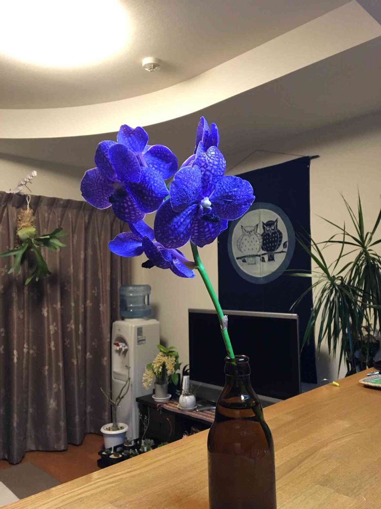 バンダの花が少し傷んできたのでカット✂️、適当な花瓶が無いので取り敢えずビール瓶に一輪挿し。😂