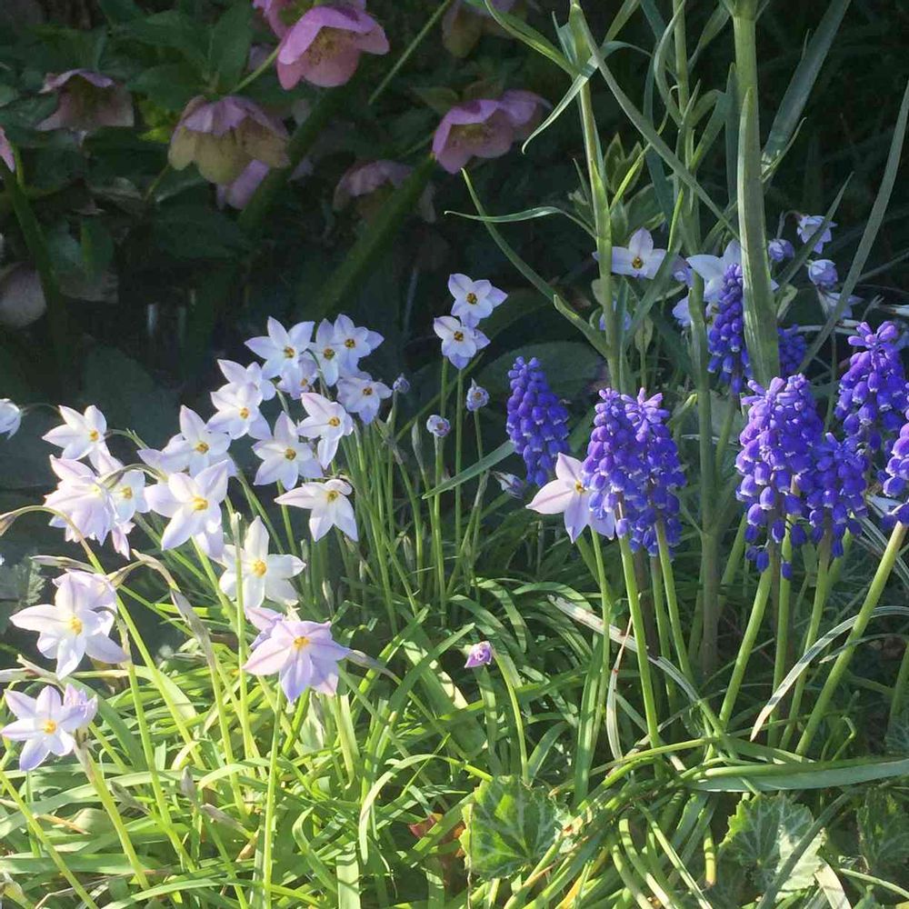 ムスカリのブルーだけだと 北側では少し暗く感じますが、ハナニラの淡い色がムスカリを引き立ててくれてるようです😊