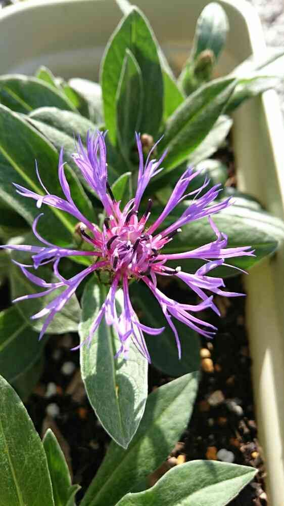 おはようございます☀爽やかな朝ですね。お家で庭仕事したい気分(*_*)去年10月宿根草を探し始めてHCで見つけたセントーレアモンタナ。葉っぱが広がりすぎるので、地植えからコンテナに移すなど引越ばかりさせてしまったけど、無事開花♥蕾も沢山ついてます。携帯でパチリ(^-^)v今日も一日頑張りますかね✨