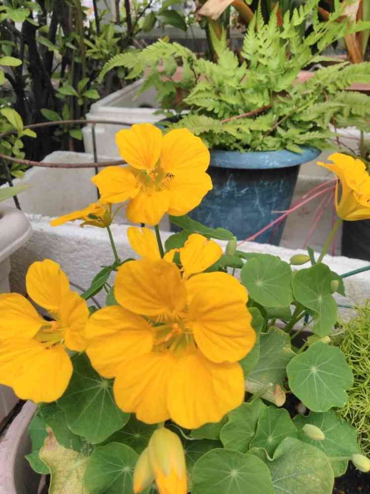 運動不足解消に散歩(ウォーキング?)。用水路沿いに近所の方々が育てていました(キンレンカ)ナスタチウムです