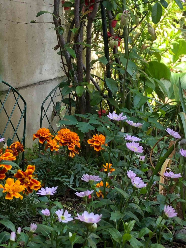 マリーゴールドと都忘れ、奥はオダマキ(まだ蕾)とボケ。ちょっと分かりづらいですね。