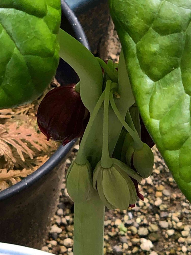 庭の鉢植えの八角蓮、やっと紫色の花が顔を出して来ました💕