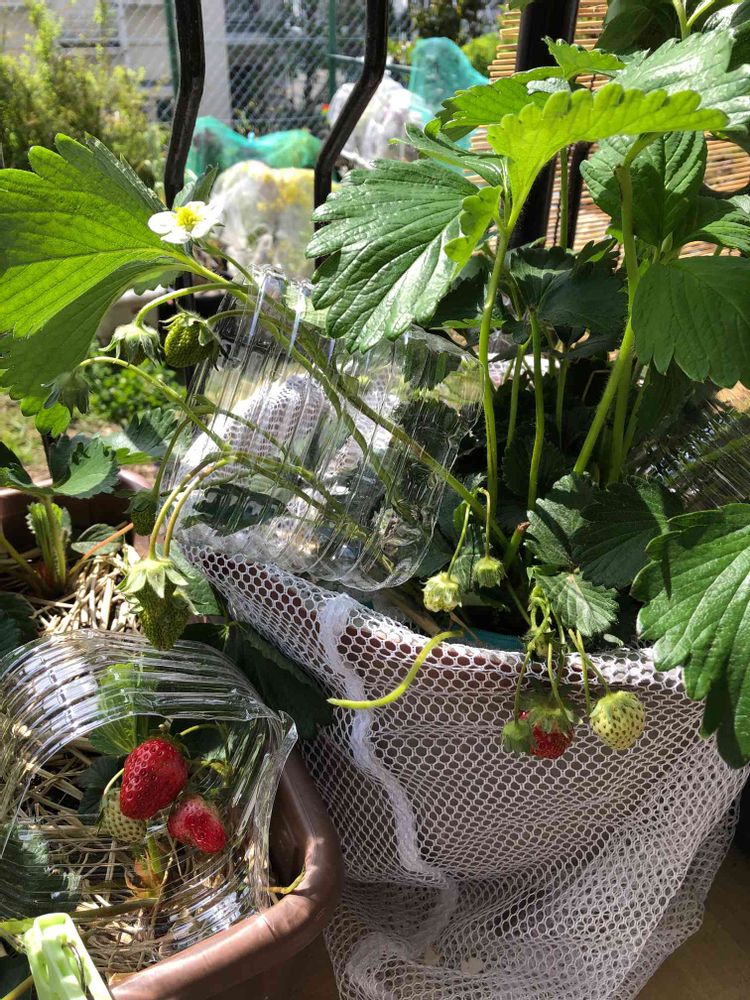 さん、おはよーございます(⌒▽⌒) 私のイチゴ鉢は洗濯ネットと虫除けネットの上下作戦🐛🐜🐌🐧🐦それでも落ちる🌱新芽...見逃している虫がいそうです。ペットボトルは気温が高くなるように風よけと鳥除けのつもり🤗ですね〜 雨降りの土の跳ね返りは実が痛みますね食べるにもチョット残念🙍♀️敷き藁とかペットボトルとか皆さんのやり方を教えて貰って良いと思いますよ〜 ガンバローネ🥰