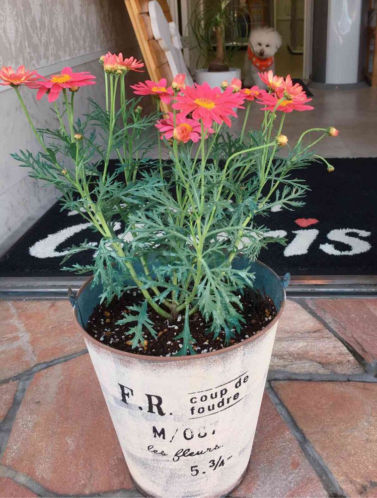 うーちゃんがこっちをつぶらな人みで見てますね〜ピンク色のマーガレットかわいぃー💕