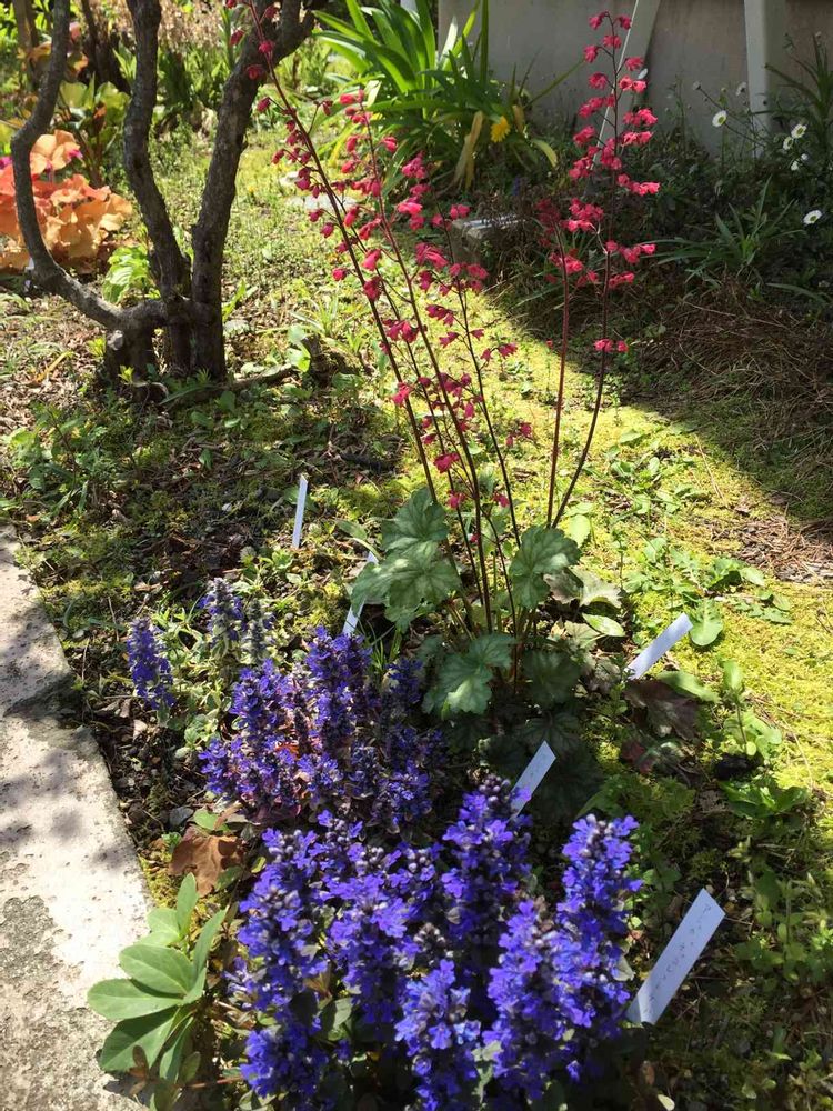 ヒューケラ「パリ」(赤い花)とアジュガ(紫の花)が咲いています。昨年秋、ネットで購入して地植え。アジュガは手前から、「チョコレートチップ」「ディクシーチップ」「シルバークイーン」。花の色は同じですが、葉の色がそれぞれ違って綺麗です。