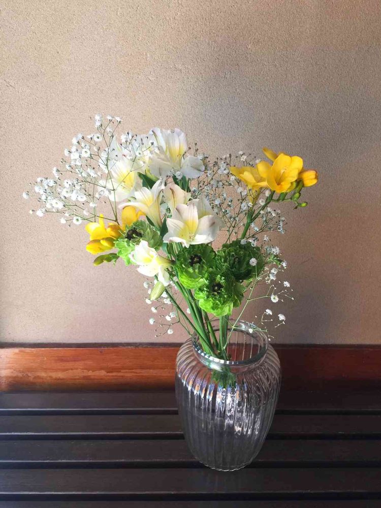 花束を作ってみました。緑色のラナンキュラスが可愛いです(╹◡╹)