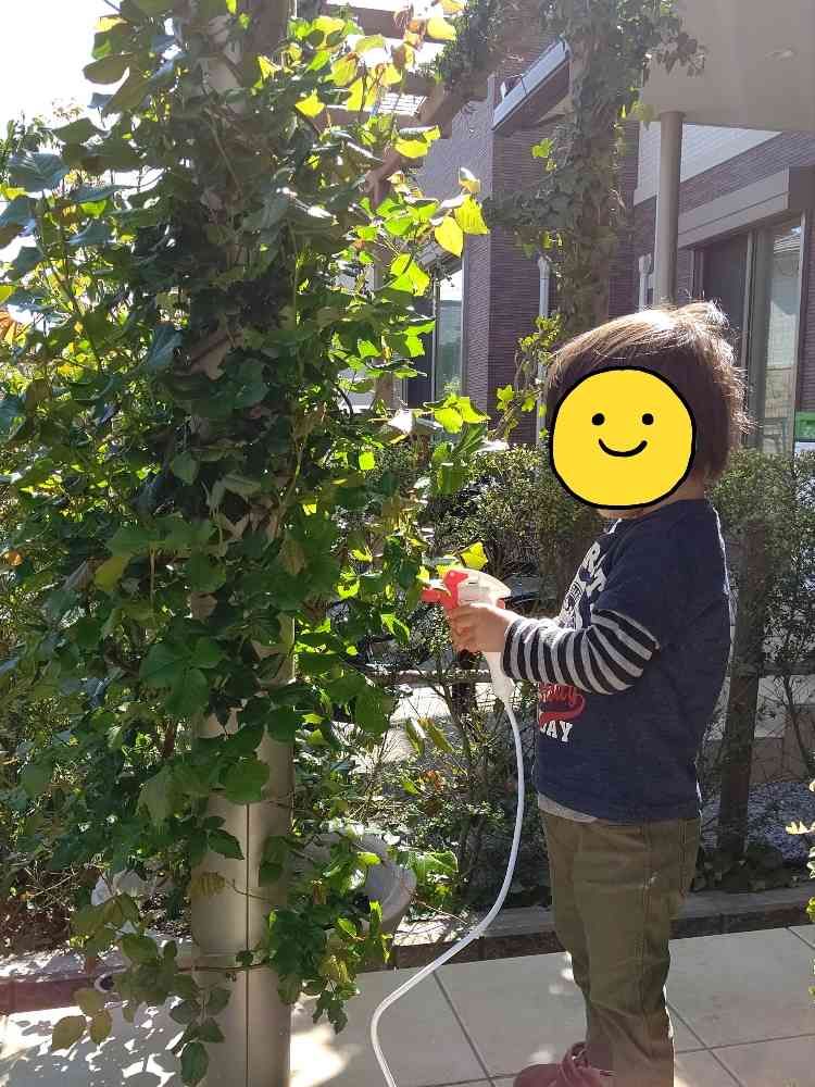 ガーデニング男子に育てようと目論見中の長男。ピキャットクリア散布中。