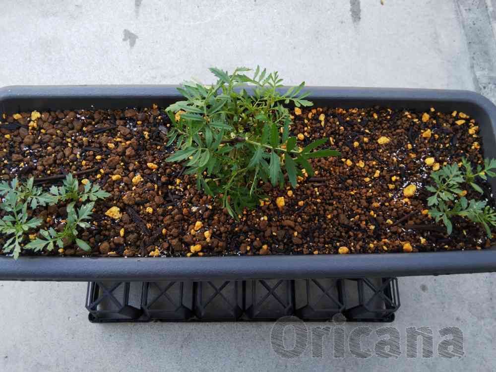 去年の採種、ほんとは橙と黄色があったんですけど、長方形プランターでの三色寄せ植えって地味に難しいと思うので(特に真ん中の子は、真夏にはまっ黄色になる可能性があるようですし)、今回は黄色の苗は植えませんでした。(両サイド左右ともに橙が咲くと思います)